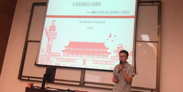 馬克思主義學院博士研究生孫澤海同學則從三個方面詮釋偉人毛澤東堅定不移的共產主義初心和其偉大的歷史貢獻。少年時期毛澤東便懷揣著雄心壯志,正因為毛澤東永遠把黨為人民謀幸福的事業放在個人得失之前,他才能夠在革命生涯中不畏艱苦,初心不改。無論走到哪里,不能忘記為什么出發,要到何處去。我們重溫毛澤東的初心與使命,也時刻提醒我們不忘初心,傳承西遷精神。