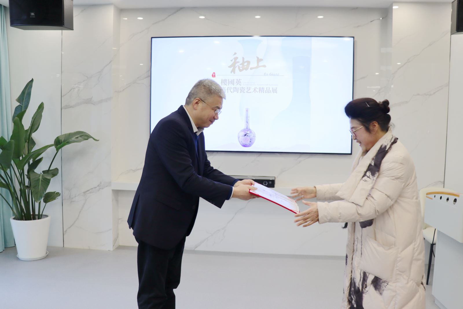 ? ? ? ?隨后,中國陶瓷藝術(shù)設(shè)計(jì)大師樓國英向西安交通大學(xué)蘇州研究院贈(zèng)與作品,張劍鋒副院長代表西安交通大學(xué)蘇州研究院向樓國英教授頒發(fā)客座教授聘書。各位領(lǐng)導(dǎo)嘉賓隨后一同來到展覽現(xiàn)場,由策展人為各位領(lǐng)導(dǎo)嘉賓導(dǎo)覽。