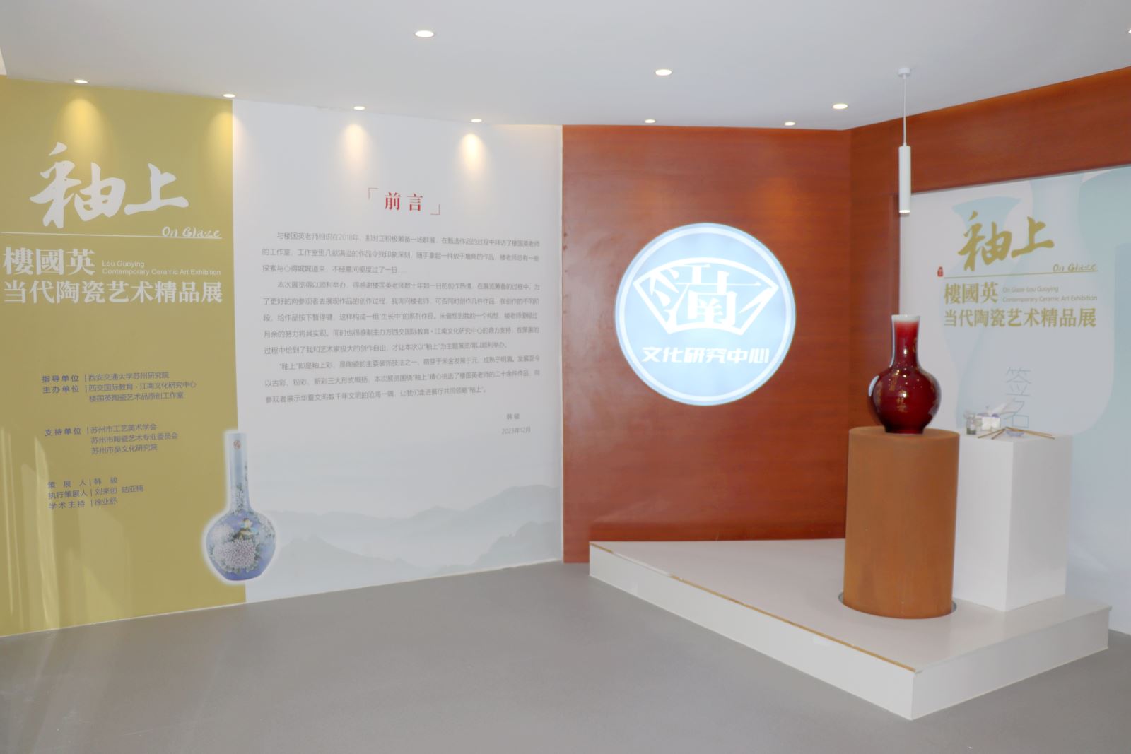 ? ? “釉上”是樓國英近幾年為數(shù)不多的個(gè)人作品展,展出空間是西安交通大學(xué)蘇州研究院的江南文化研究中心。自成立以來,該中心提煉出一系列富有江南文化特色的精品課程或文化創(chuàng)意作品,并積極向?qū)W生輻射。本次策展旨在為廣大學(xué)生普及傳統(tǒng)文化中國陶瓷藝術(shù)的魅力。