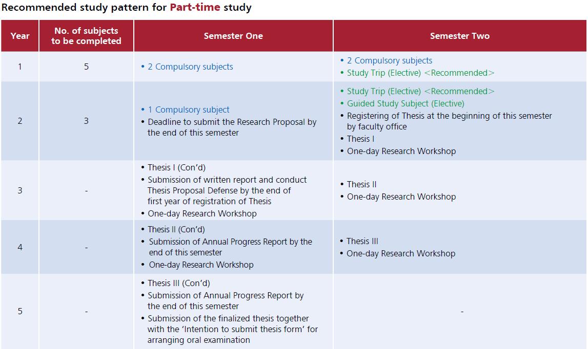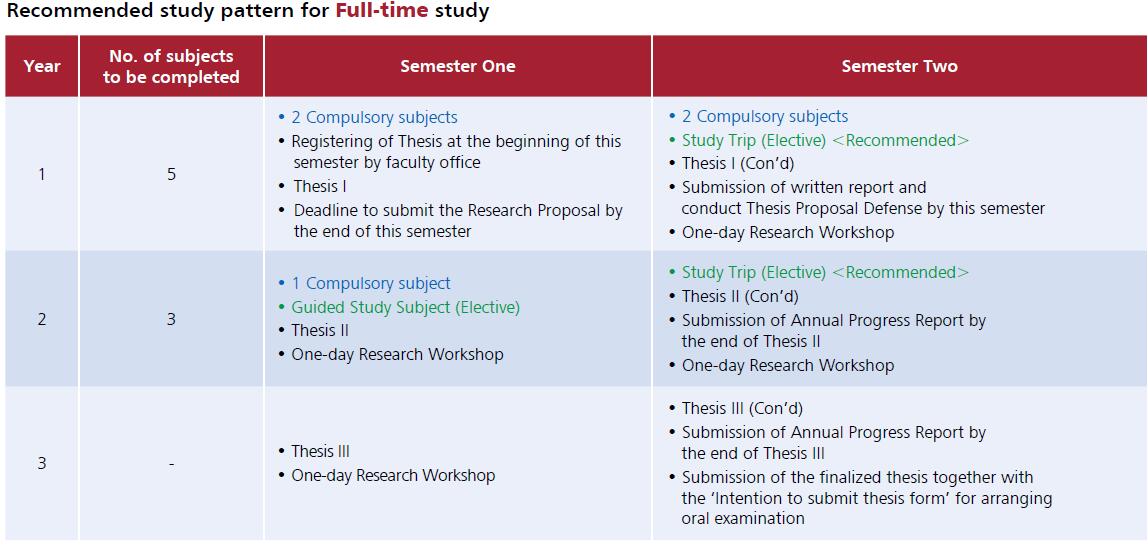 • Candidates are required to pass 5 Compulsory Subjects and 3 Elective Subjects, with a minimum Award GPA (AGPA) of 3.0, and complete a thesis.