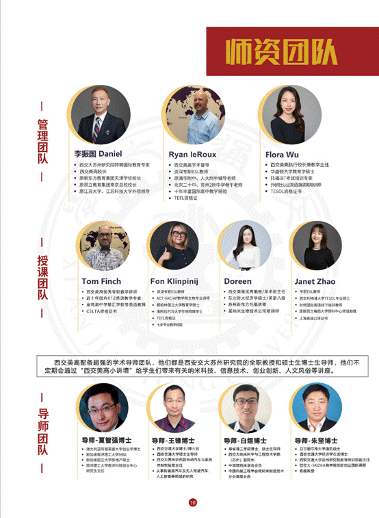 師資團隊(部分) 西交美高特別聘請多位國際教育專家組成一流的師資及管理團隊,為學生在校期間提供最全面的學習成長保障。 外教均為英美澳加等認證外教,平均擁有7年以上教學經驗,1:6超高師生比,給予每個學生最高的關注度。